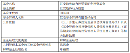 中国经济网北京10月14日讯今日,汇安基金公告,单柏霖离任汇安趋势动力股票。